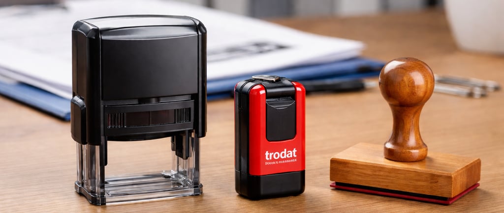 Carimbo Automático (Plástico): Ideal para assinaturas e validação de documentos repetitivos. A almofada interna é recarregável e o movimento é suave.