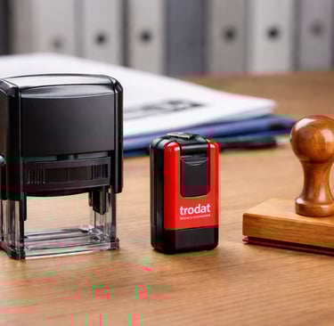 Carimbo Personalizado com Logotipo: Fundamental para a identidade visual da empresa. A matriz de borracha precisa ser de alta definição para que as letras pequenas não borrem.